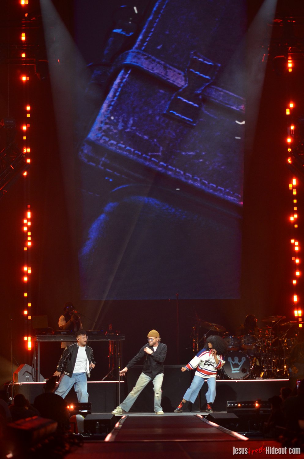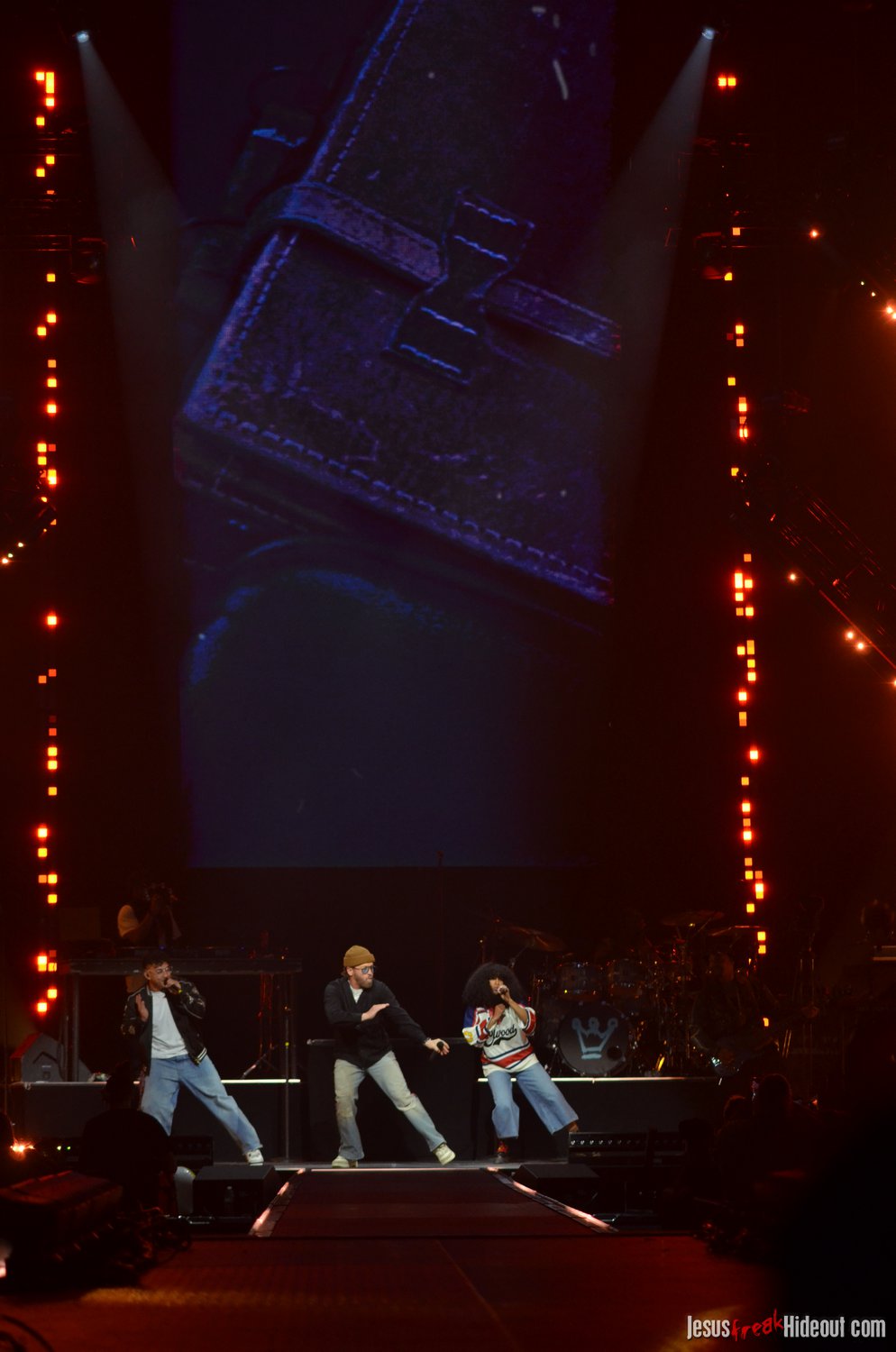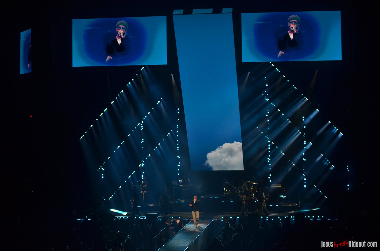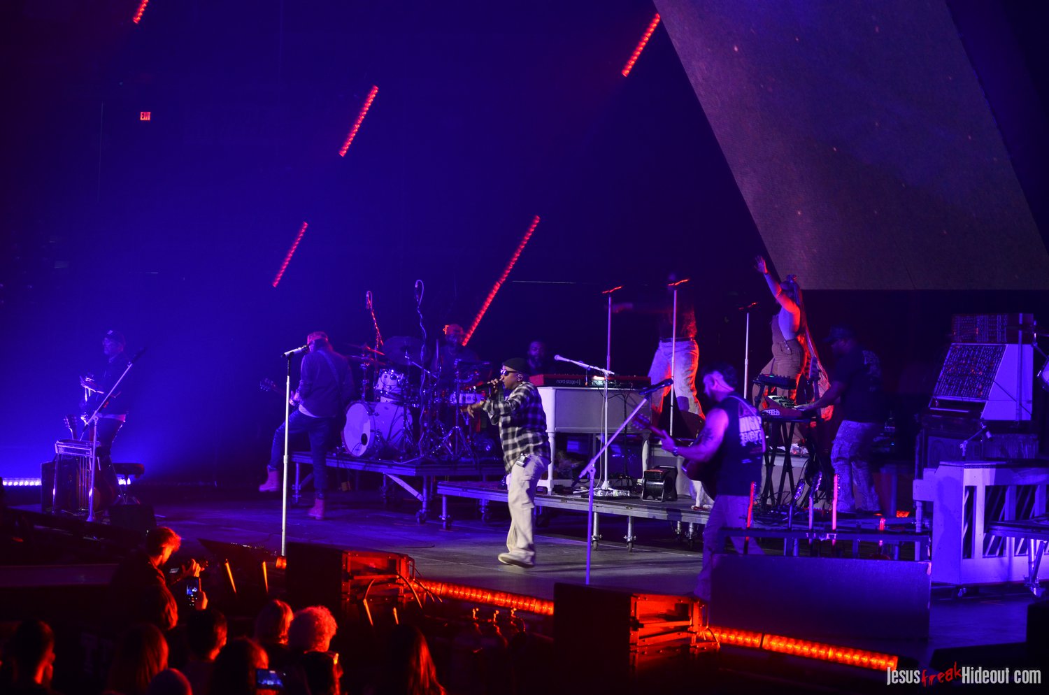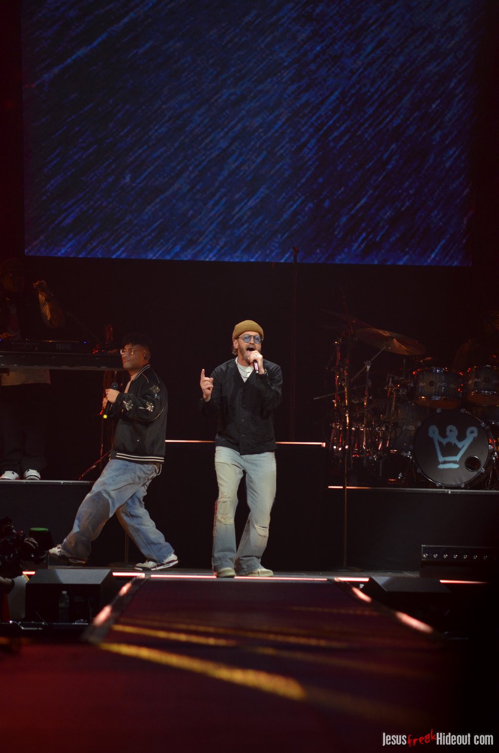 So, around 9pm, TobyMac and the Diverse City band took the stage. I later realized it's been about 7 or 8 years since I last saw TobyMac perform, but I was still a little surprised to see so many new faces in the Diverse City band. It kind of felt like a "Next Generation" deal, but - as you can always expect - Toby knows talent and knows how to surround himself with some of the best in the biz, so you can expect him to have an entourage with him that impresses. I was surprised to hear him open with "Light Shines Bright" from This is Not a Test, which he immediately followed with "Hello Future" from The Elements. They seemed a little like deep cuts to me, but they were solid openers. Toby wasted no time dancing with his bandmates and kicking up the energy. "Everything" was next - complete with featured horn and keytar accompaniment, and then he busted out the smash hit "I Just Need U." "Heaven on My Mind," followed, and Toby made use of the screens to insert a pre-recorded duet with Forrest Frank - a little trick he'd utilize again later. He then walked out on the catwalk and shared a bit about his testimony before playing "Love Broke Thru" and "Help is on the Way." The worshipful "Cornerstone" was next, and Toby paused to share a word on Psalm 9:9-10 (MSG), and then continue the song, adding a pre-recorded guest spot by Zach Williams and concluding the song with a chorus of "Lose My Soul." Streamers burst into the air for "The Goodness," and then Toby and his bandmates marched down the center stage to "Move (Keep Walkin')."
