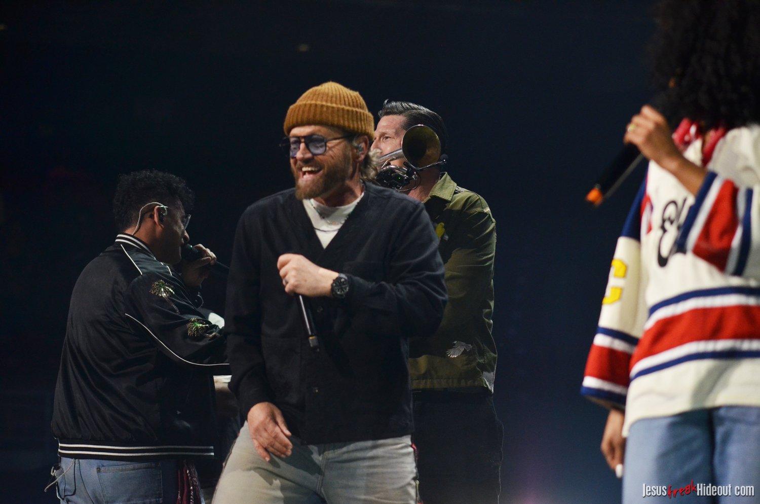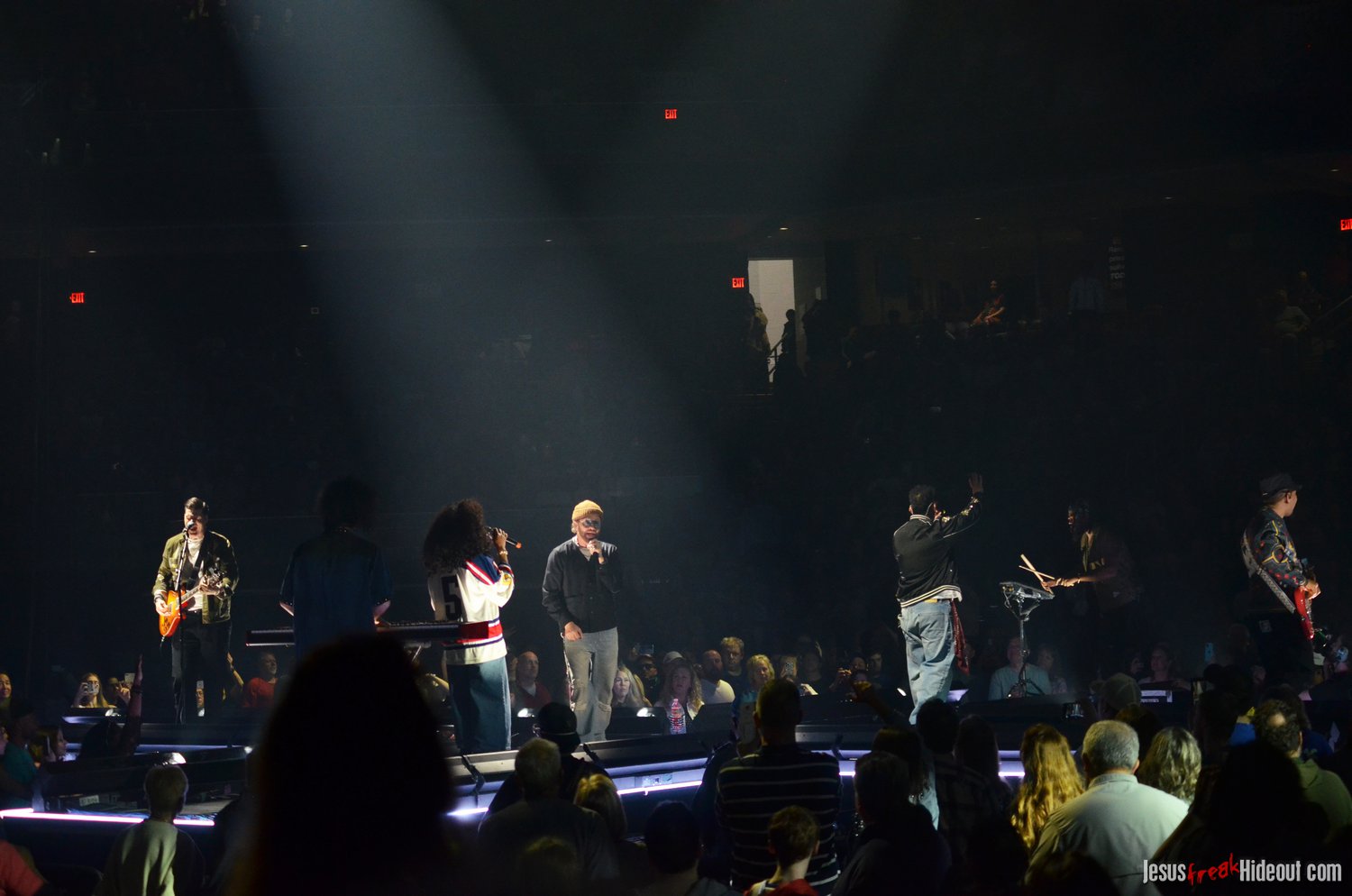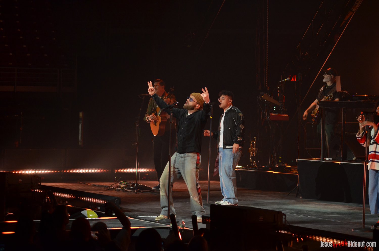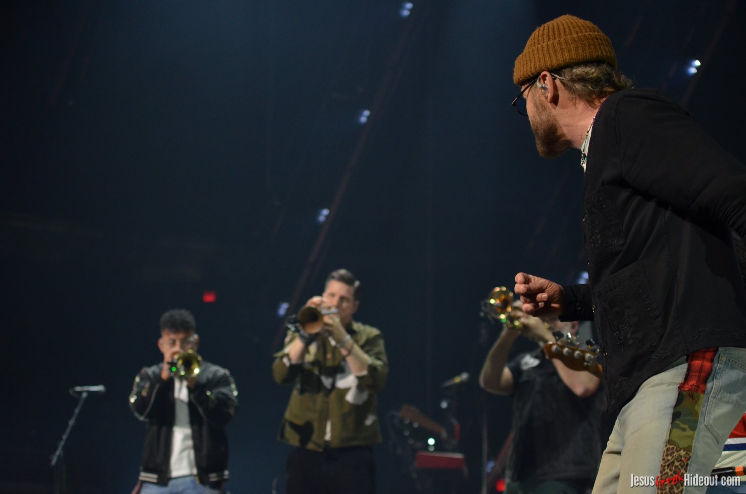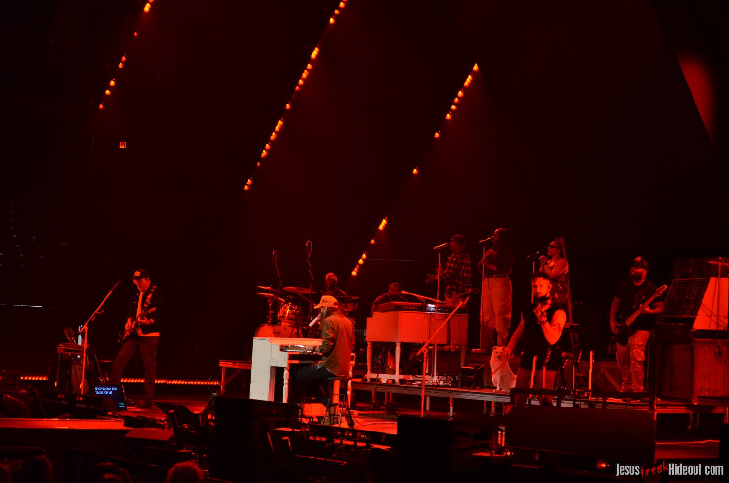 So, around 9pm, TobyMac and the Diverse City band took the stage. I later realized it's been about 7 or 8 years since I last saw TobyMac perform, but I was still a little surprised to see so many new faces in the Diverse City band. It kind of felt like a "Next Generation" deal, but - as you can always expect - Toby knows talent and knows how to surround himself with some of the best in the biz, so you can expect him to have an entourage with him that impresses. I was surprised to hear him open with "Light Shines Bright" from This is Not a Test, which he immediately followed with "Hello Future" from The Elements. They seemed a little like deep cuts to me, but they were solid openers. Toby wasted no time dancing with his bandmates and kicking up the energy. "Everything" was next - complete with featured horn and keytar accompaniment, and then he busted out the smash hit "I Just Need U." "Heaven on My Mind," followed, and Toby made use of the screens to insert a pre-recorded duet with Forrest Frank - a little trick he'd utilize again later. He then walked out on the catwalk and shared a bit about his testimony before playing "Love Broke Thru" and "Help is on the Way." The worshipful "Cornerstone" was next, and Toby paused to share a word on Psalm 9:9-10 (MSG), and then continue the song, adding a pre-recorded guest spot by Zach Williams and concluding the song with a chorus of "Lose My Soul." Streamers burst into the air for "The Goodness," and then Toby and his bandmates marched down the center stage to "Move (Keep Walkin')."