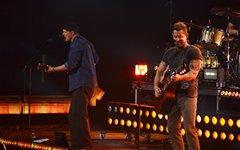 From the merch table: Oh, there were lots of goodies for fans to choose from. Prices seem so much steeper these days, so hoodies were $70 and shirts were $40, but some of the booths had discounted items. I was surprised to see Toby wasn't selling any vinyl records, but he did have $10 CD's, and Crowder had Milk & Honey and The Exile on vinyl. There were a lot of other accessories, too, like bracelets, hats, posters and drum sticks - so there were definitely some fun items to check out. (You can see the quick mobile photo snaps I grabbed below.)
