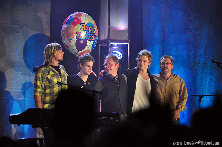 As it got later and later, I noticed how unusual it was for a Sunday night concert to be running so late. I knew Steven had more songs ahead of him and Mary Beth hadn't even spoken yet. While I personally didn't care, I had to wonder if some of the rest of the audience did (especially those with kids in school). But for Steven's second set, he opened with "The Great Adventure." And of course, since this was the final night of the tour, that inevitably is grounds for pranking! And as Steven played, the guys in Caleb came galloping out on stage and Geoff Moore joined in the singing, while Steven's band members revealed themselves to be wearing old school SCC tour shirts and gear -- some brightly colored and tailor made for girls. It was a great way to add a little extra humor to the night without performing any truly disruptive or destructive pranks (which could ruin the experience for those who paid good money for a night of music). The fun anthem "Live Out Loud" followed, with "Lord Of The Dance" close behind. Steven then introduced the band members - Ben Davis on bass, Bryan Green on keys and his sons - and then offered props to the tour guys as well, especially since this was the tour's grand finale. Chapman took some time next to tell the story behind "Cinderella," at first saying he didn't have time to tell the story but ultimately told it anyway. He performed "Cinderella" and then began to introduce Mary Beth. To do it, he performed some of "I Will Be Here" as just himself and his piano, and then invited Mary Beth onto the stage. And since November 21st also happened to be Steven Curtis's birthday, Mary Beth marched out onto the stage carrying a large birthday balloon with much of the tour crew following her and she lead the audience in singing "Happy Birthday" to the bashful artist. SCC relished in that opportunity to introduce more tour crew members (since they were now on stage with him) and thank them for their participation in the event.