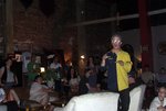 As we waited for the event to begin, the few who had arrived thus far were treated to the sound check for White Collar Sideshow. The set up was one of the most unique I had seen in a long time, with two drum sets (one in front, one in back), a keyboard, a bass guitar, a steel barrel on the floor in front of the stage, and a contraption made up of things like cowbells, table saw blades and a bicycle wheel. I had heard of their unique show, but was about to experience it for the first time. The band's frontman came up to the front with another guy after the sound check was ready, and said "Ladies and gentlemen, the man of many words, Levi the Poet." The crowd was still pretty small at this point, but a few people cheered, and then Levi began to speak. He spoke his first line into the microphone, but then decided he didn't want or need the microphone. He began to stagger around the room, speaking, yelling and hollering insightful words to his heart's content. At the very beginning, I thought that he was going to be some sort of late-coming Bradley Hathaway copycat. But as he walked around the room and spoke his words about the girl that nobody loves that gives up her body to a different man every night, telling her that she's beautiful and very loved, I could definitely see the difference between Levi and Hathaway's poetry. I found Levi's poetry to be a lot more passionate than Hathaway's (not to say Hathaway wasn't passionate, but I was moved more by the words and emotions in Levi's poetry). You can find some of his poetry on YouTube.com/LevithePoet and you can download the poem he did, called "Kaleidoscope," for free from his Facebook page.