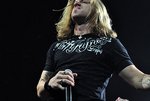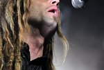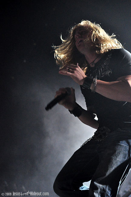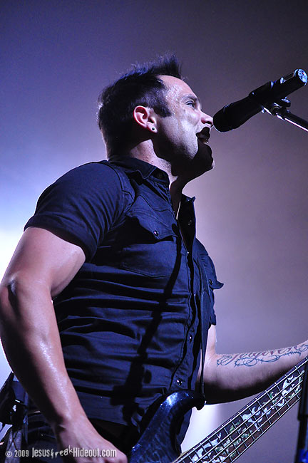 After a brief set change, rock band Decyfer Down took the stage. Now, it's been several years since I'd seen the band live and when I had, original vocalist Caleb Oliver was fronting the group. Last year, Caleb exited for Fighting Instinct's vocalist TJ Harris to step in. I had seen TJ's former act on tour with Family Force 5 in '06, so it was a little weird to see him now fronting a different band altogether. Stylistically, Decyfer Down is kind of your usual brand of hard rock, and TJ's strong vocals and flowing blonde hair give them a bit of an 80's light metal flair. They opened with the song "Crash," and then proceeded with "Desperate," also from their new record. Their seven-song set mixed up cuts from both of the band's releases, but the same problem that plagued their latest record rings true during their live show -- Decyfer Down just sounds like too many other popular bands, to the point where they don't really have their own definable sound. Before long, the guys were off the stage and fans were gearing up for the first headlining act of the night.