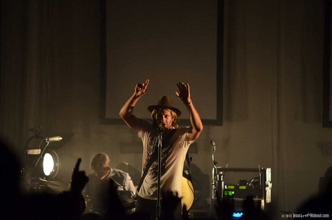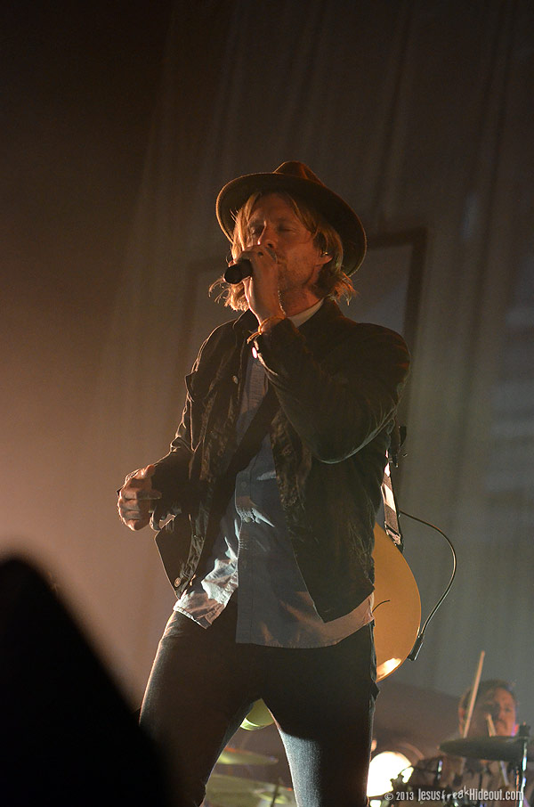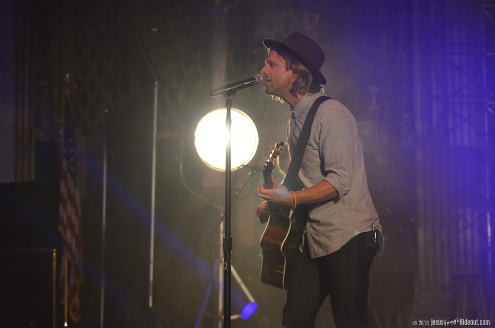 Jon Foreman typically will post on his personal Twitter account the place and time of a special "after show" performance he will do with just an acoustic and no mic or additional equipment. It'll often be in a parking lot or on a street corner, and anyone willing to stick around will get to hear a few more live songs. On this night, knowledgeable fans slipped outside and waited in front of the Keswick sign for a little while until it was evident that there would be no after show. We, and a few other stragglers, decided to check the parking lot out back to see if we were missing something and found a sizable crowd had gathered near the band's bus. The waiting around continued for quite some time; it was officially an hour after the band's stage performance ended when Jon Foreman emerged from the venue and grabbed his acoustic off the bus, ready to serenade a music-hungry fan base. With gratitude on his lips, Foreman proceeded to play a handful of songs, including Fiction Family's "Just Rob Me," before asking the onlookers to choose the next song. Foreman gave the option of either "Company Car" or "Stars," but the audience seemed so split evenly on those songs that Foreman decided to play both. After thanking the audience for their enthusiasm and encouragement, Jon closed with the worshipful "Your Love Is Strong," playing by the glow of cell phone flashlights, with the parking lot crowd singing along passionately.