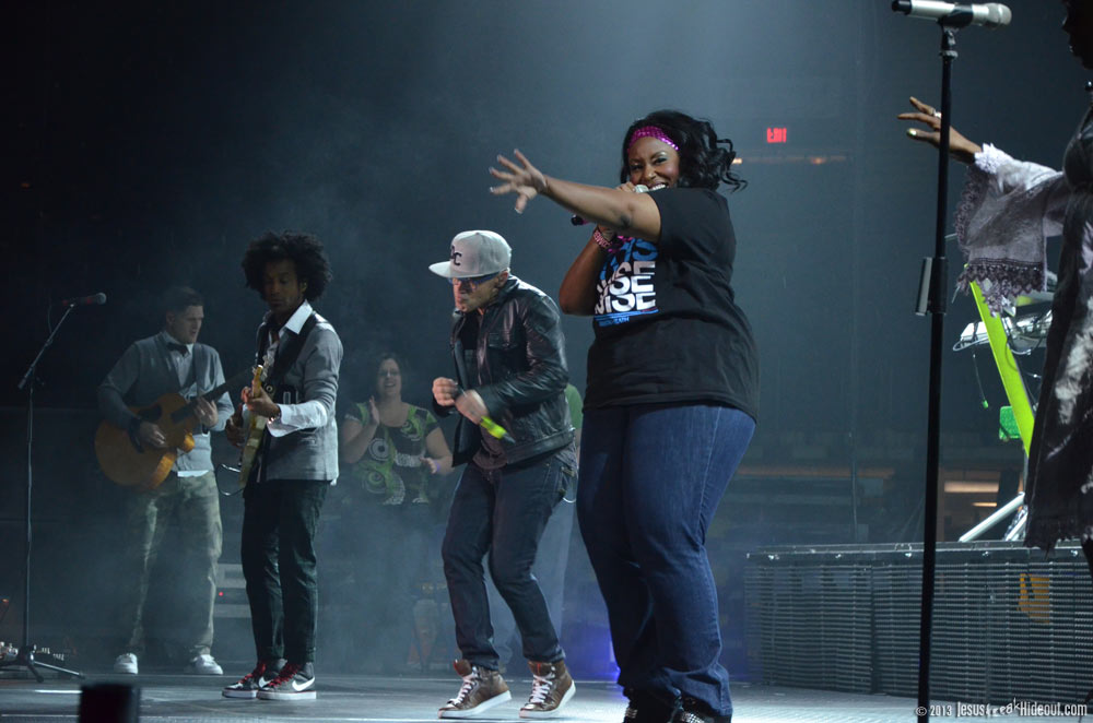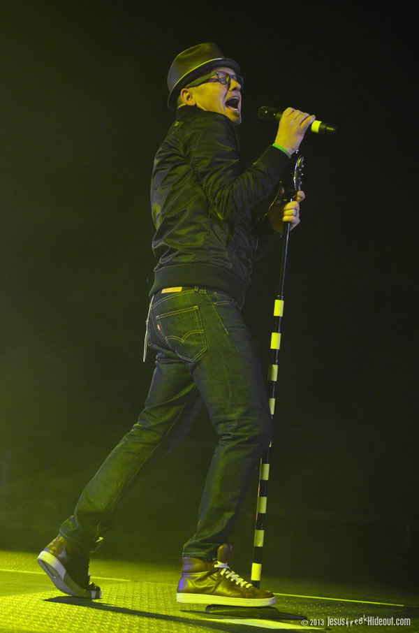 While a lot of the night resembled last year's tour (save for the absence of Group 1 Crew and Britt Nicole and the addition of Capital Kings and Colton Dixon), Toby changed his set list up a little bit (but not a whole lot), as well as the stage layout. Gone was DJ Maj's towering platform in exchange for a lower stage profile altogether. Instead of opening with "Made To Love" (which he'd just perform later), the former DC Talk member and his Diverse City entourage opened with Eye On It's "Lose Myself" and then moved into the title track from Tonight. Cryogenic cloud bursts accented the song, as well as its follow-up, "Unstoppable," and then Toby stopped to talk to the audience. He joked about having talked to everyone's bosses and schools, giving permission to everyone in the crowd that they won't have to go into work or class until noon, and was then joined by Brandon Heath to perform "Steal My Show." Toby then talked about impacting others and how we have the opportunity to give life when interacting with people, or drain it, and used this to segue into Eye On It's "Speak Life." Toby and his crew kicked up the energy a notch for "Boomin'" and "Eye On It," with the latter featuring a marching band drum troupe from several of the Diverse guys, and then DJ Maj offered up his solo set to the tune of Toby's "Mac Daddy" interlude from Eye On It as a distraction to allow Toby, GabeReal and Tim Rosenau to make their way to the back of the arena for an acoustic set. When a series of large, glowing lightbulbs that descended from the ceiling illuminated above them, Toby's trio opened with an acoustic take on "One World" before talking about writing the next song, "Hold On," for his wife Amanda. He then talked about DC Talk and what the Reading, PA area meant to him and the history of his former band, and then performed an acoustic version of his seasonally appropriate original, "Christmas This Year." For this song, Jamie Grace joined the trio to sing Leigh Nash's part from the recorded version. They then broke into DC Talk's version of Charlie Peacock's original "In The Light," and invited Chris August on stage to sing with them. Toby then inserted the rap verse from the remix of "Jesus Freak" (that was on the 1995 single for the song) as a nice treat for old school fans. Toby then talked about rap in the CCM realm and Lecrae's impact on it, and began performing "Forgiveness," a song that featured Lecrae on the recorded version. They then pointed everyone's attention to a video on stage of Lecrae performing his rap verse as Toby, Gabe and Tim ran back to the stage to finish the song with the full band. Mandisa joined the band for the next song, the Gospel flavored "Lose My Soul," and then Jon from Capital Kings joined the band for "Get Back Up." The guest appearances didn't stop there, however, as Jamie Grace came back out for "Funky Jesus Music" (with DJ Maj playing a trumpet) to close the main part of Toby's set. But anyone who's seen Toby in concert knows that a sixteen song set probably would considered a short one to him, so Toby and his band re-emerged for a hefty encore that started with "Made To Love" (with Tim on the trumpet this time) and then a worshipful moment with "City On Our Knees" and "Bless the Lord O My Soul." But it just wouldn't be the Hits Deep Tour without a star-studded finale, and all of the artists in attendance joined Toby and the Diverse City band for his hit "Me Without You" and the confetti-laden closer, "Winter Wonderland" for the big finish.