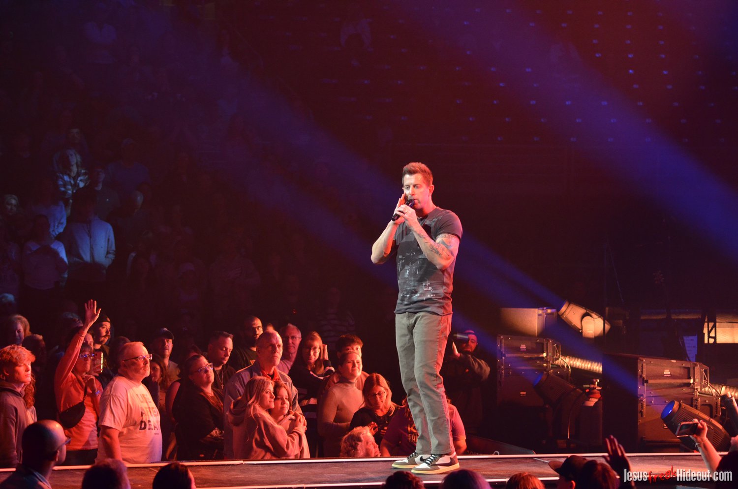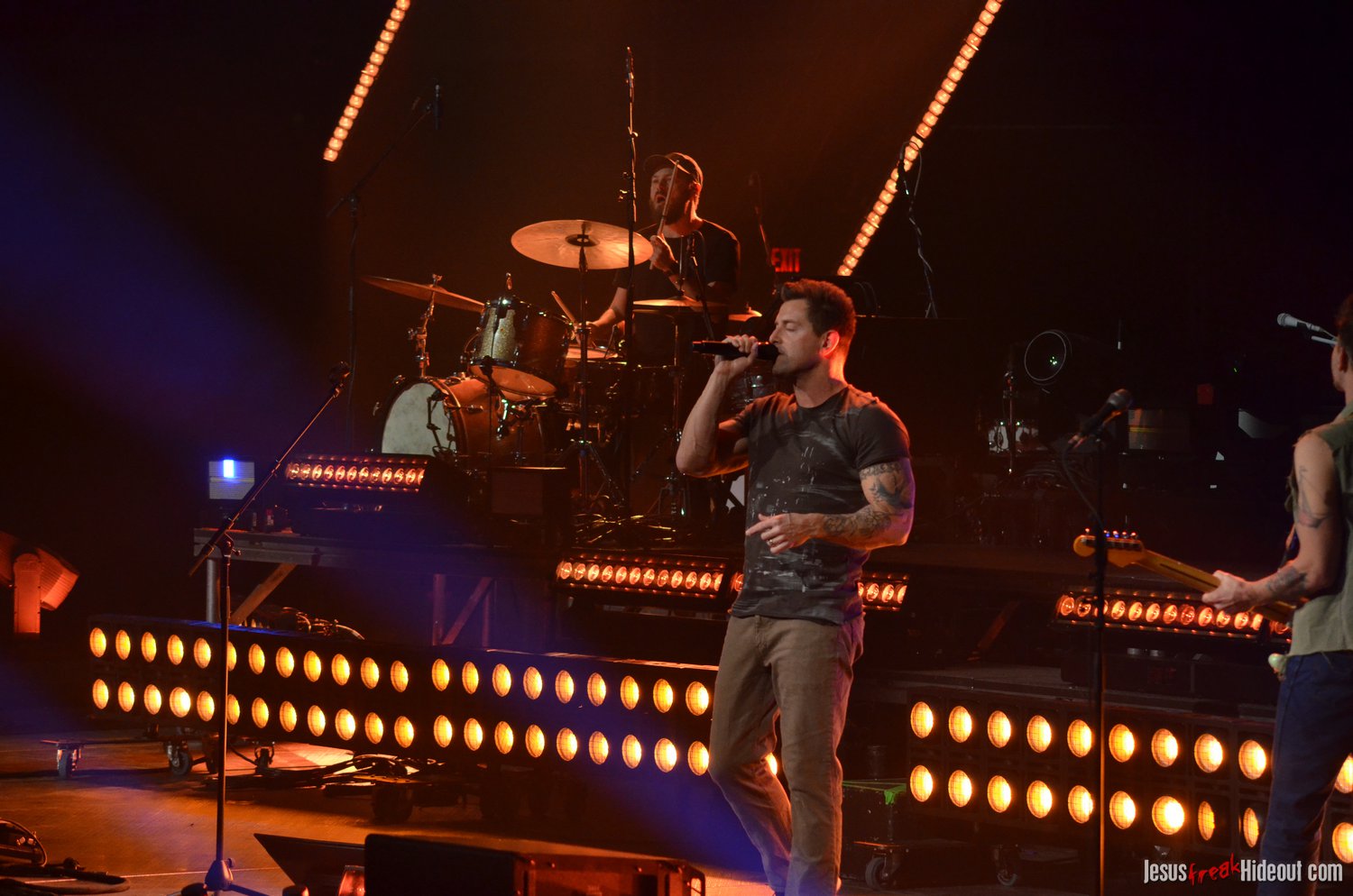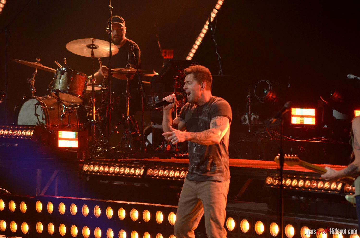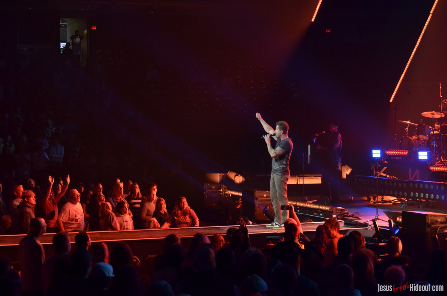The stage layout for the tour is pretty impressive. One look at it and you instantly can understand why there are three full size tractor trailers parked out front. It's massive. The front of the stage expanded to include a full-size cross-shaped stage extension. I've found cross-shaped stages to seem a little tacky at worship events and such, but in this context, it somehow feels less gaudy and more practical - especially in how it would be used during the night. Jeremy used the stage about mid-way to get closer to the audience, and it worked well for his set. He had a full band and, while we were there, performed hits like "Keep Me in the Moment," "Getting Started" and "No Survivors." I was pleased to see him not being afraid to lean into his rock roots a bit more, too, and it made for a more captivating set. The night supposedly began around 7pm (I wasn't there on time to verify that), but Camp was done with his set around 7:35.