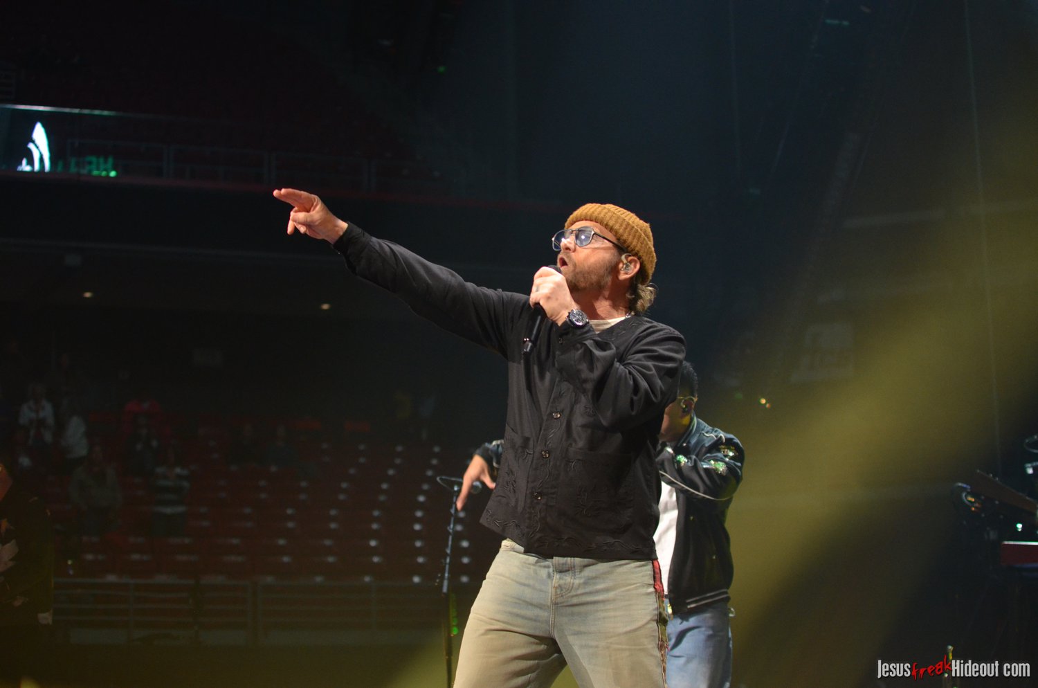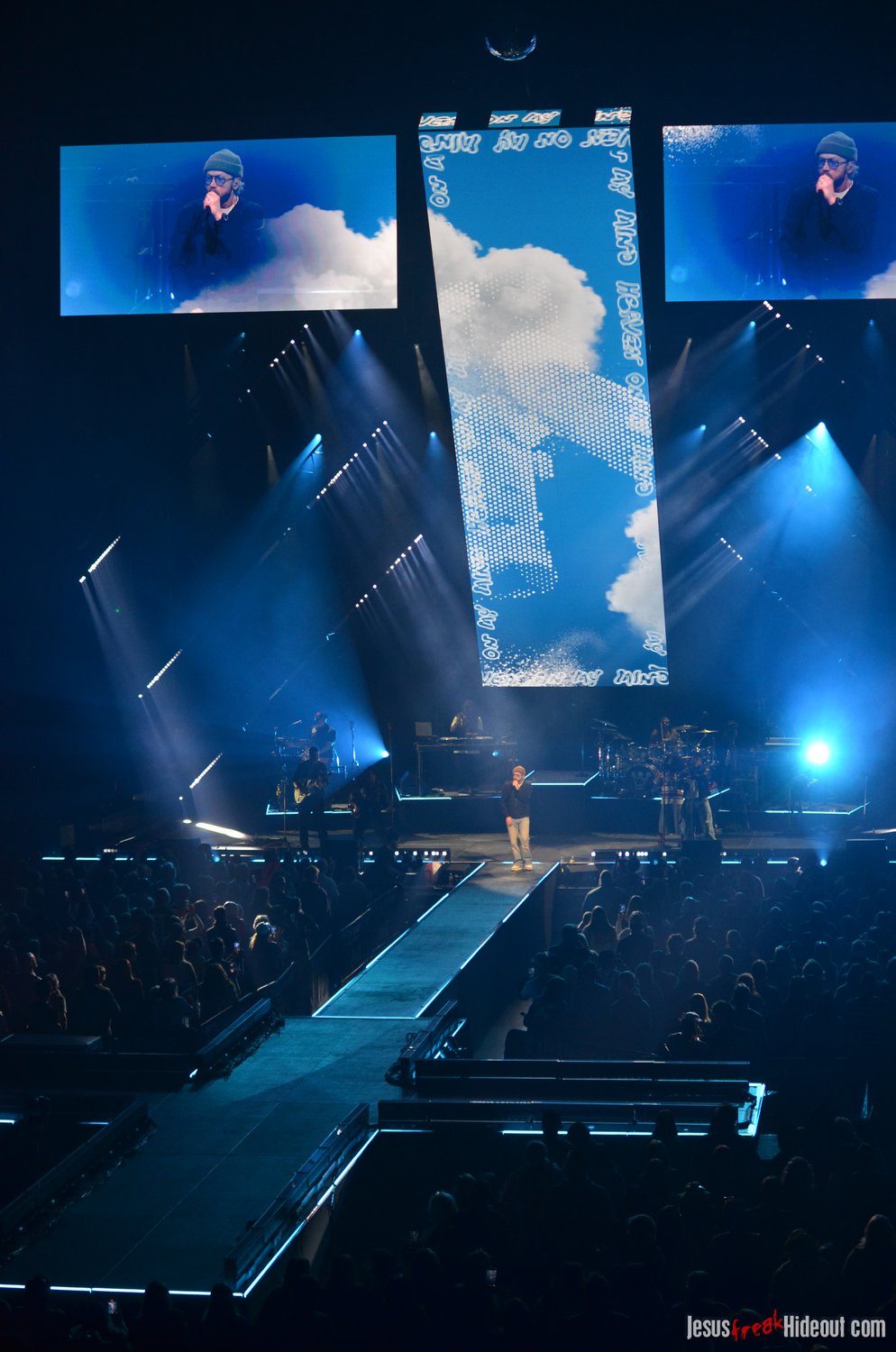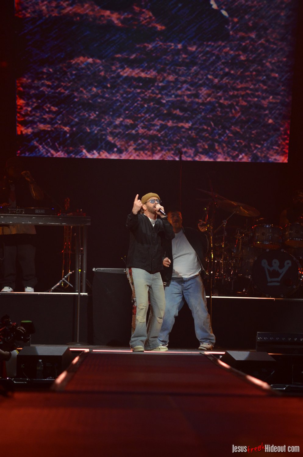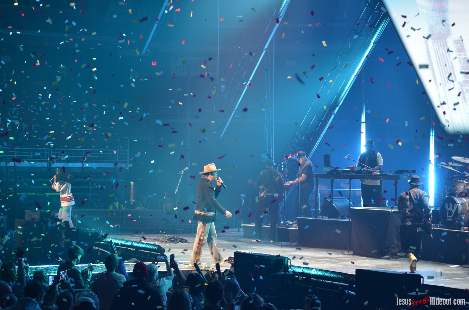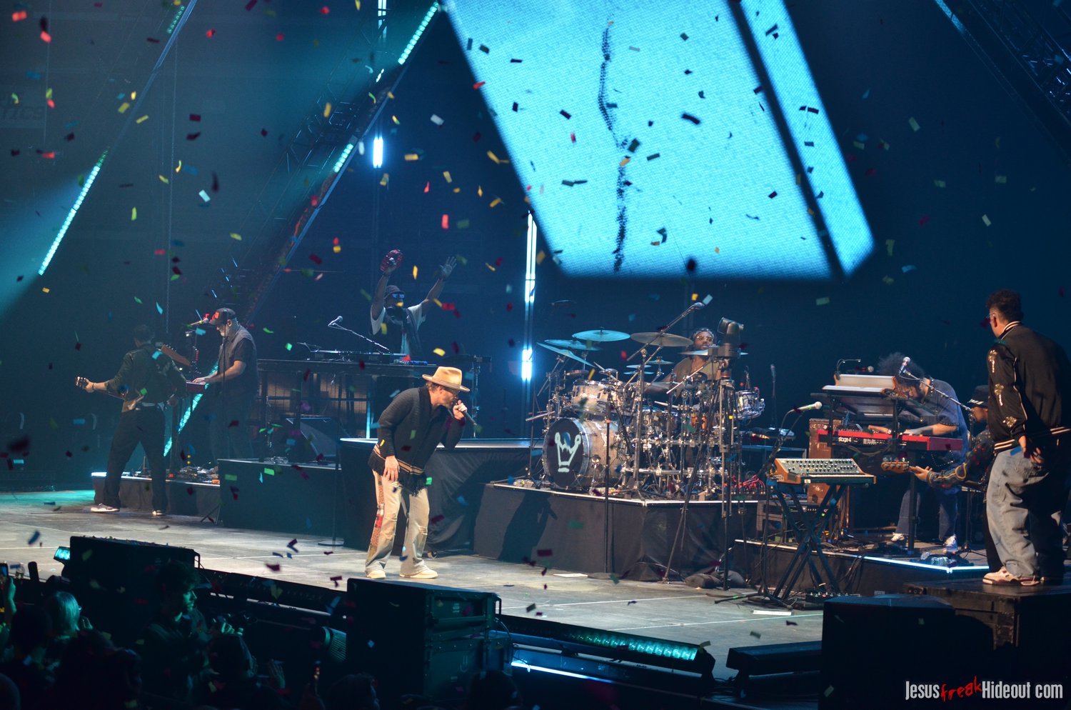 So, around 9pm, TobyMac and the Diverse City band took the stage. I later realized it's been about 7 or 8 years since I last saw TobyMac perform, but I was still a little surprised to see so many new faces in the Diverse City band. It kind of felt like a "Next Generation" deal, but - as you can always expect - Toby knows talent and knows how to surround himself with some of the best in the biz, so you can expect him to have an entourage with him that impresses. I was surprised to hear him open with "Light Shines Bright" from This is Not a Test, which he immediately followed with "Hello Future" from The Elements. They seemed a little like deep cuts to me, but they were solid openers. Toby wasted no time dancing with his bandmates and kicking up the energy. "Everything" was next - complete with featured horn and keytar accompaniment, and then he busted out the smash hit "I Just Need U." "Heaven on My Mind," followed, and Toby made use of the screens to insert a pre-recorded duet with Forrest Frank - a little trick he'd utilize again later. He then walked out on the catwalk and shared a bit about his testimony before playing "Love Broke Thru" and "Help is on the Way." The worshipful "Cornerstone" was next, and Toby paused to share a word on Psalm 9:9-10 (MSG), and then continue the song, adding a pre-recorded guest spot by Zach Williams and concluding the song with a chorus of "Lose My Soul." Streamers burst into the air for "The Goodness," and then Toby and his bandmates marched down the center stage to "Move (Keep Walkin')."
