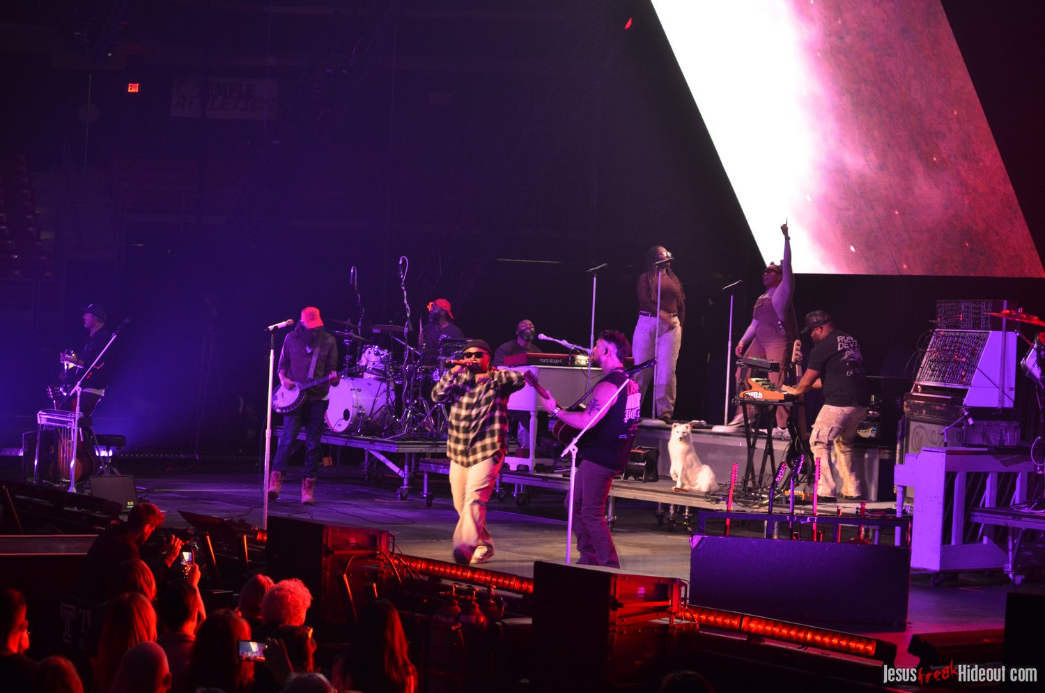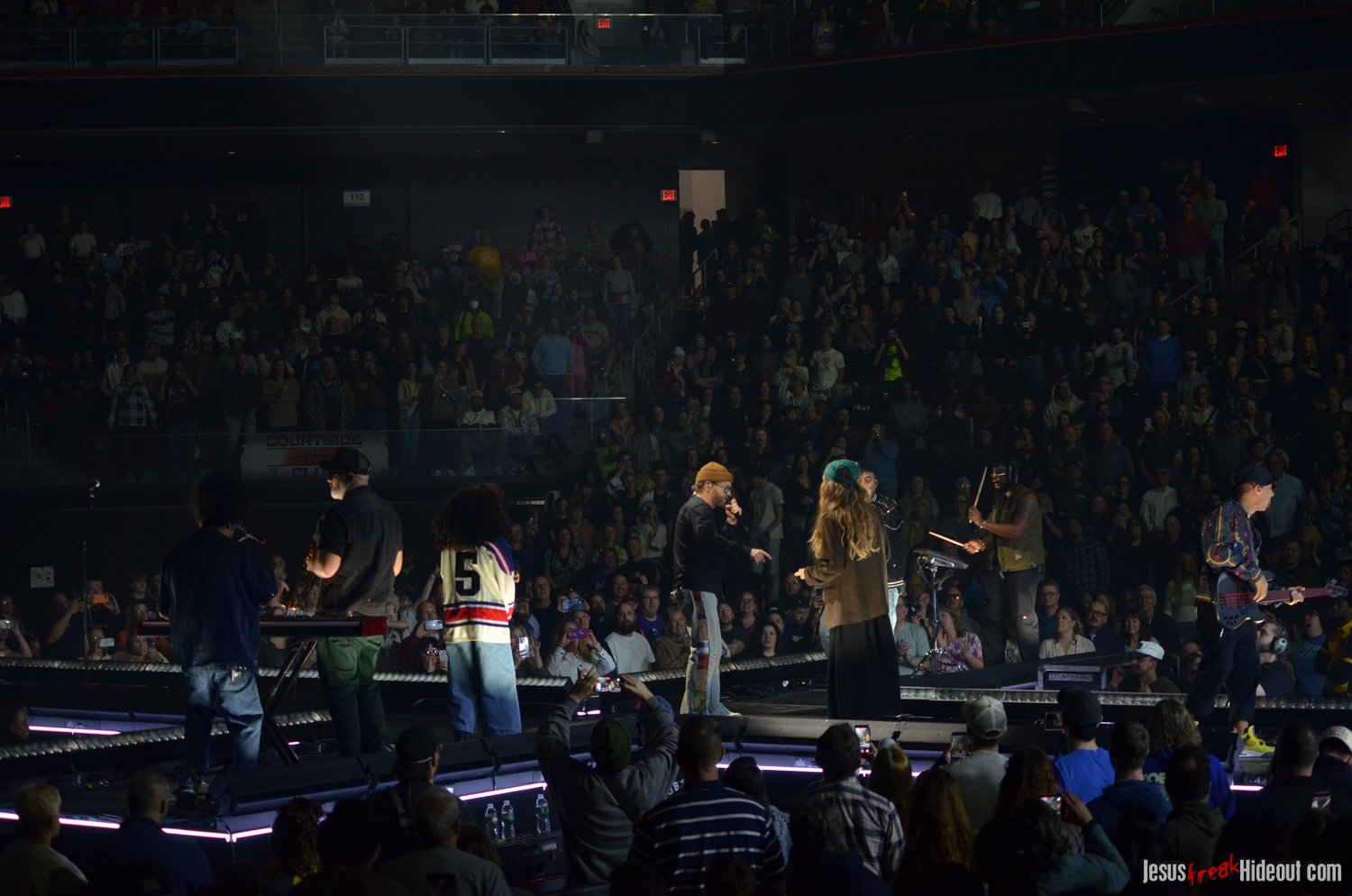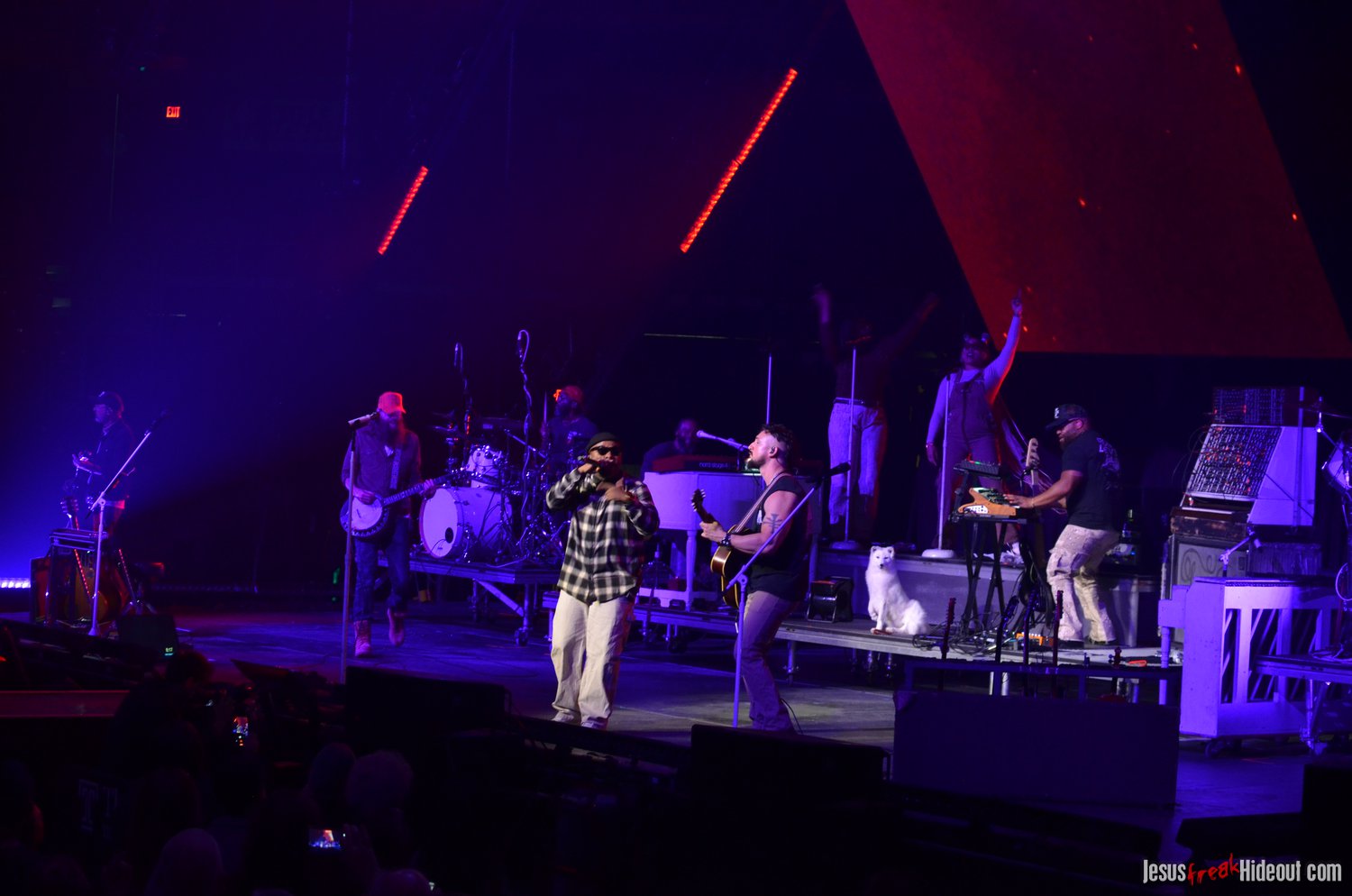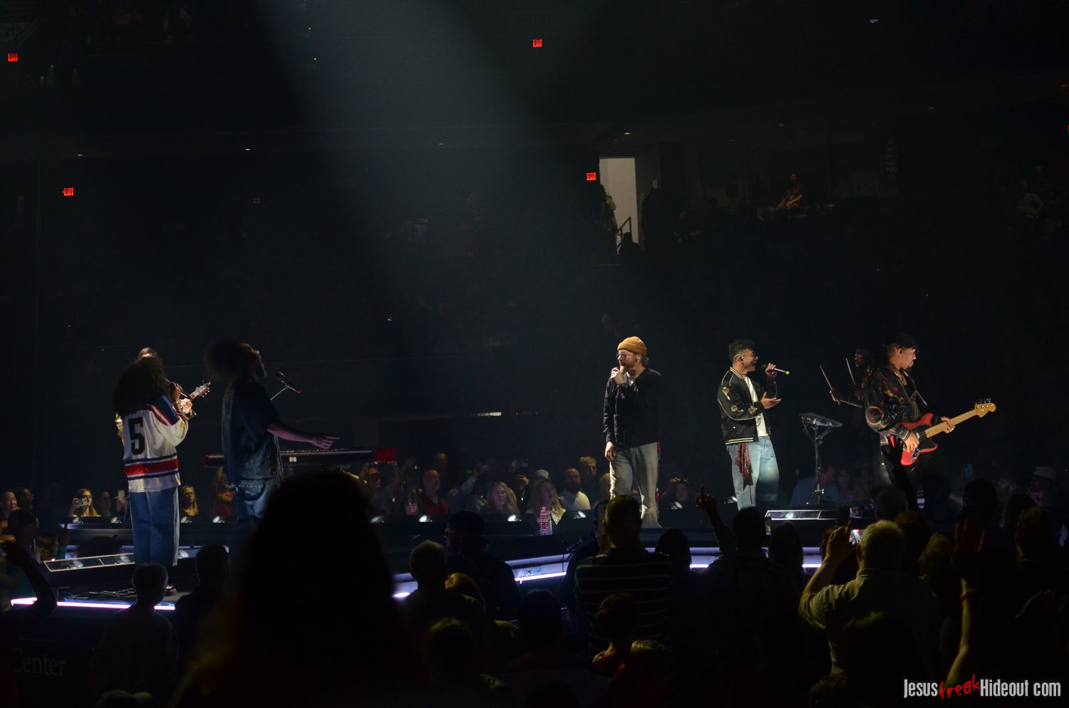So, around 9pm, TobyMac and the Diverse City band took the stage. I later realized it's been about 7 or 8 years since I last saw TobyMac perform, but I was still a little surprised to see so many new faces in the Diverse City band. It kind of felt like a "Next Generation" deal, but - as you can always expect - Toby knows talent and knows how to surround himself with some of the best in the biz, so you can expect him to have an entourage with him that impresses. I was surprised to hear him open with "Light Shines Bright" from This is Not a Test, which he immediately followed with "Hello Future" from The Elements. They seemed a little like deep cuts to me, but they were solid openers. Toby wasted no time dancing with his bandmates and kicking up the energy. "Everything" was next - complete with featured horn and keytar accompaniment, and then he busted out the smash hit "I Just Need U." "Heaven on My Mind," followed, and Toby made use of the screens to insert a pre-recorded duet with Forrest Frank - a little trick he'd utilize again later. He then walked out on the catwalk and shared a bit about his testimony before playing "Love Broke Thru" and "Help is on the Way." The worshipful "Cornerstone" was next, and Toby paused to share a word on Psalm 9:9-10 (MSG), and then continue the song, adding a pre-recorded guest spot by Zach Williams and concluding the song with a chorus of "Lose My Soul." Streamers burst into the air for "The Goodness," and then Toby and his bandmates marched down the center stage to "Move (Keep Walkin')."
