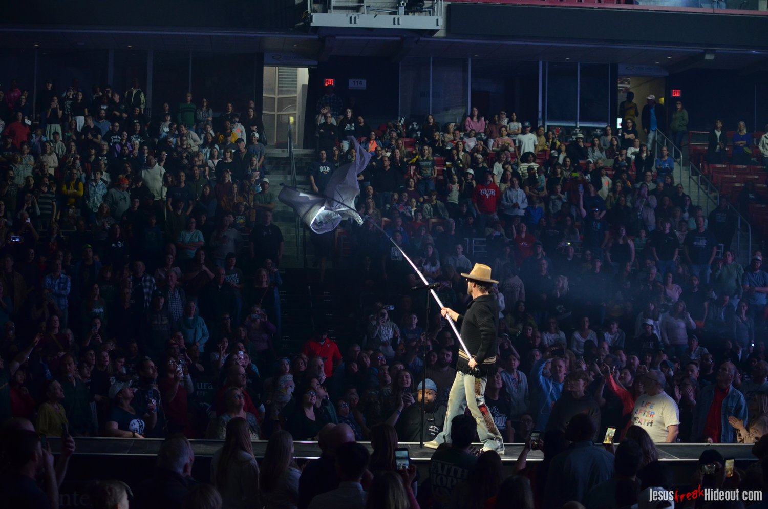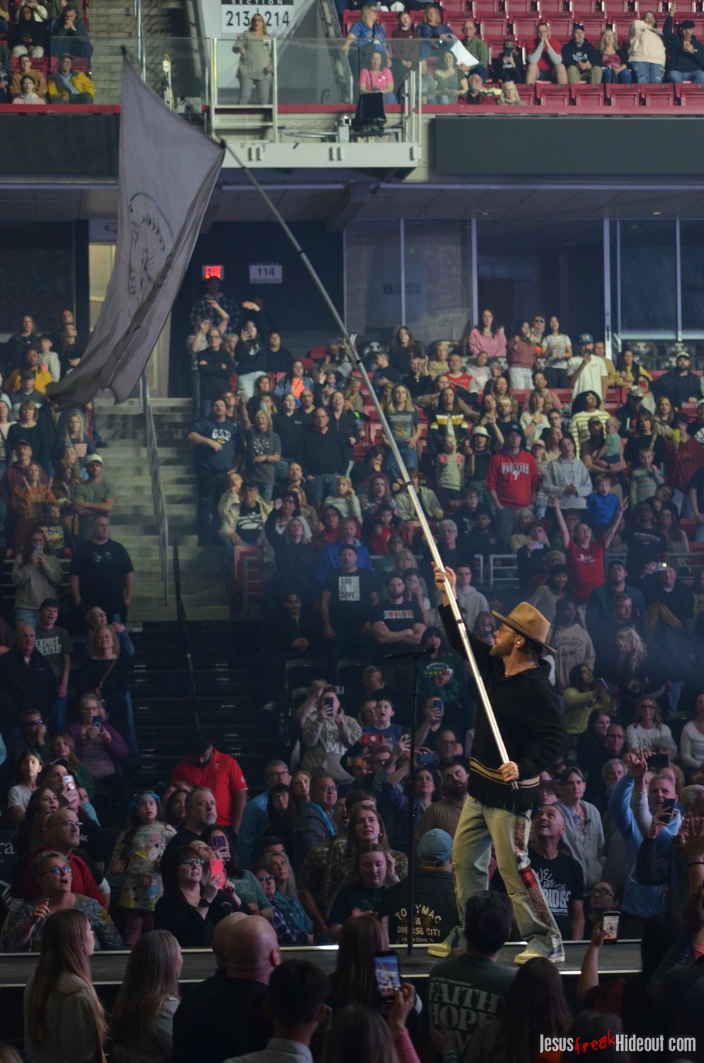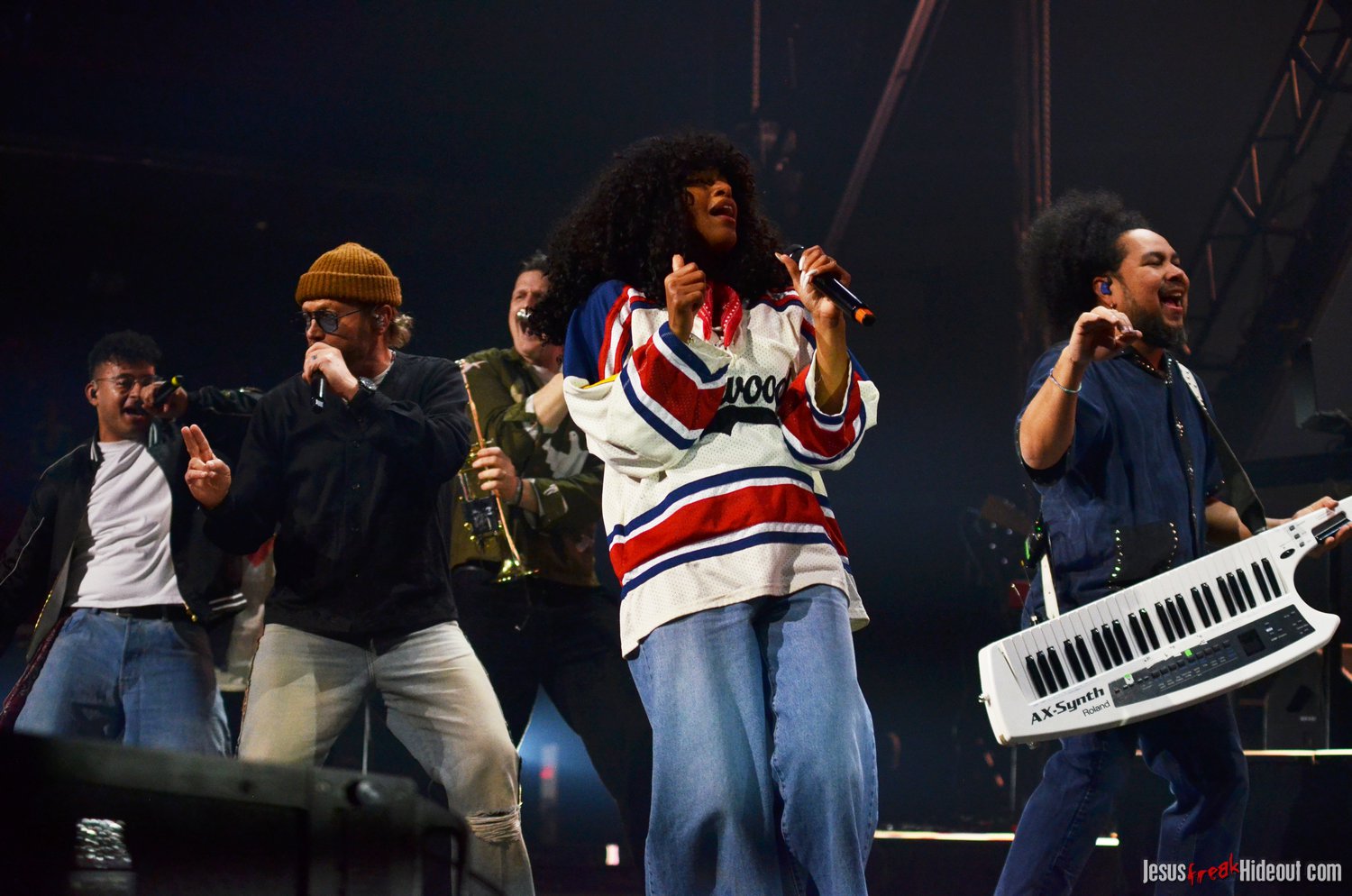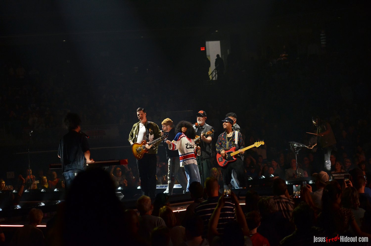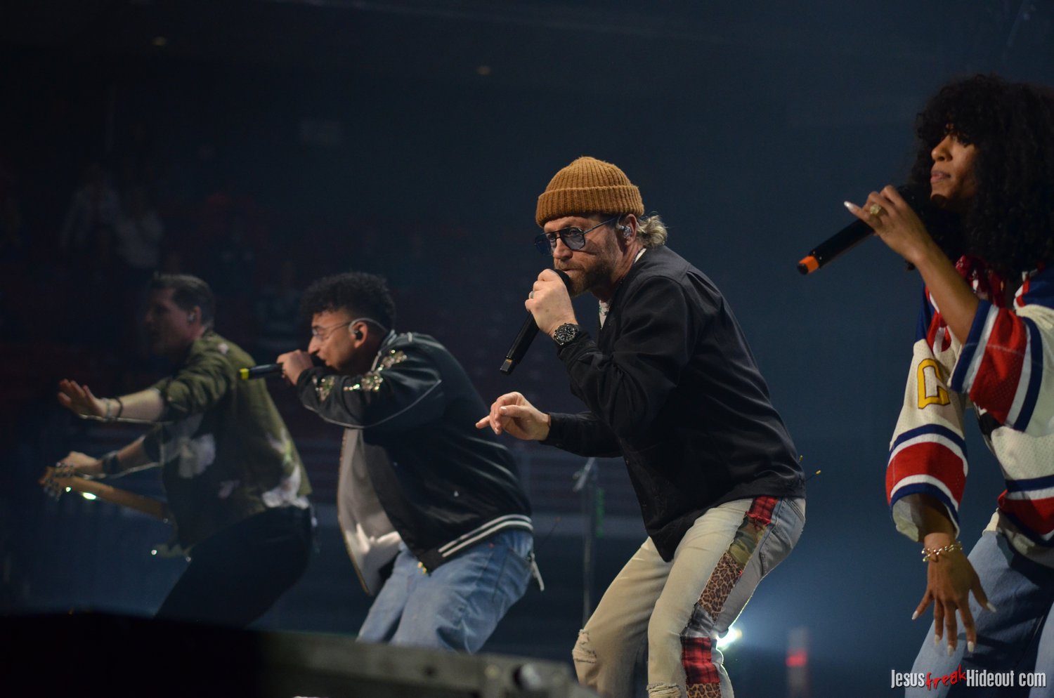 So, around 9pm, TobyMac and the Diverse City band took the stage. I later realized it's been about 7 or 8 years since I last saw TobyMac perform, but I was still a little surprised to see so many new faces in the Diverse City band. It kind of felt like a "Next Generation" deal, but - as you can always expect - Toby knows talent and knows how to surround himself with some of the best in the biz, so you can expect him to have an entourage with him that impresses. I was surprised to hear him open with "Light Shines Bright" from This is Not a Test, which he immediately followed with "Hello Future" from The Elements. They seemed a little like deep cuts to me, but they were solid openers. Toby wasted no time dancing with his bandmates and kicking up the energy. "Everything" was next - complete with featured horn and keytar accompaniment, and then he busted out the smash hit "I Just Need U." "Heaven on My Mind," followed, and Toby made use of the screens to insert a pre-recorded duet with Forrest Frank - a little trick he'd utilize again later. He then walked out on the catwalk and shared a bit about his testimony before playing "Love Broke Thru" and "Help is on the Way." The worshipful "Cornerstone" was next, and Toby paused to share a word on Psalm 9:9-10 (MSG), and then continue the song, adding a pre-recorded guest spot by Zach Williams and concluding the song with a chorus of "Lose My Soul." Streamers burst into the air for "The Goodness," and then Toby and his bandmates marched down the center stage to "Move (Keep Walkin')."