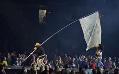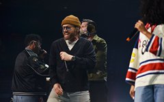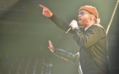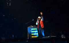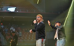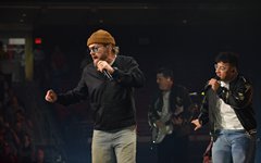At this point, Toby paused again to share from his heart, saying how, about 6 years ago, he decided to try reading the Bible from start to finish, and that, two months into that venture, he lost his oldest son, Truett. He talked about the importance of having a relationship with God, and then sung the worshipful "Faithfully." "God Did It," from his latest record Heaven on My Mind, followed, along with "a lil Church (nobody’s too lost)" from the same album. The full band migrated to the center of the cross stage for the next portion, and Toby announced the challenge to perform a medley of 5 TobyMac songs in 5 minutes - complete with a countdown. As he moved through the songs, the jumbo screen showed animations of the singles' album covers coming into focus. With Philadelphia native Hollyn as a special guest (who is also signed to his record label, Gotee Records), the band performed "Backseat Driver," "Funky Jesus Music," "Diverse City," "Me Without You" and "Feel It." The only one who had remained on the main stage was DJ Maj, and he launched into another party medley as the band made their way back to their places (but not before jumping around on the cross stage). He played a mix of "Sweet Caroline," "September," "Ooh Ahh" by Grits, and dc Talk's "Jesus Freak" - complete with Toby returning to the microphone (after a wardrobe change) for his signature rap solo. Serving as a kind of encore, TobyMac and the Diverse City band launched into "Can't Stop Me," "Til the Day I Die" - complete with Toby waving a gigantic flag, "Promised Land," and closing with "Nothin' Sweeter."