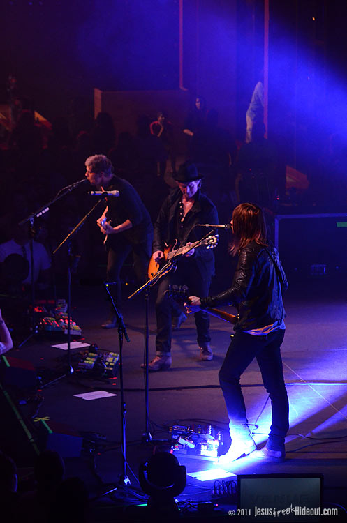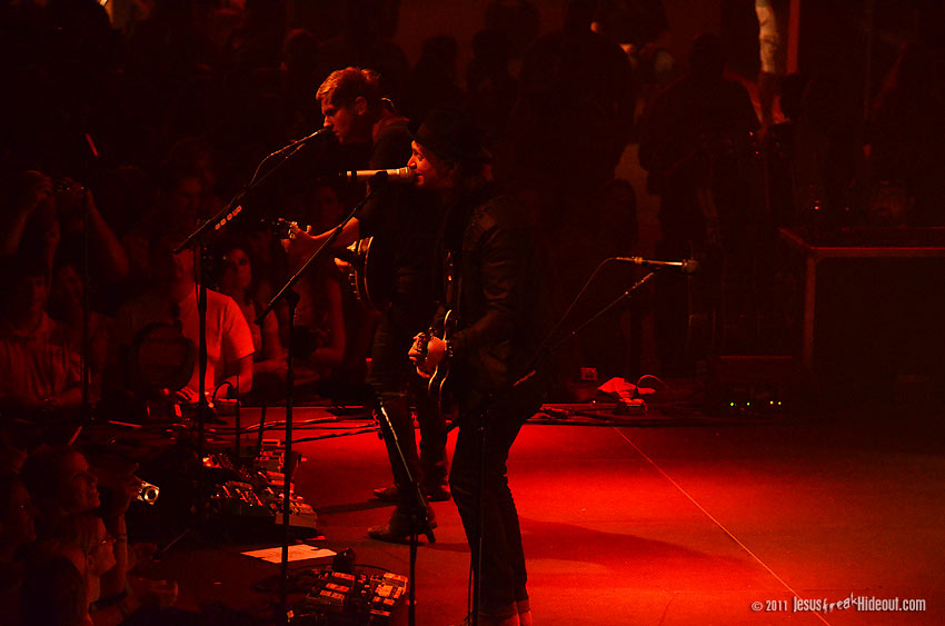 When it came time for Needtobreathe to take over, the band launched their set with a brand new track from their forthcoming fourth album, The Reckoning. I didn't catch the title, but musically, it worked well as an opener; it was a little surprising to hear the guys open with something unfamiliar to their fans. However, the energy mounted as the foursome (with a fifth as piano accompaniment), continued on with "Girl Named Tennessee," one of the standout songs from their previous release, The Outsiders. The band was clearly soaking in the intimate setting. Things continued strongly into the title track, "The Outsiders," before vocalist Bear Rinehart took a moment to address his Bethlehem audience. He briefly talked about the band's excitement for their new album and the difficulties and triumphs of working on such a project, and introduced the album's latest single, "Drive All Night." The upbeat song was followed by the first ballad of the evening, "Stones Under Rushing Water," which the guys gave a slow, building intro into the track. The slower vibe continued with "Washed By The Water," which was met with enthusiastic applause when the recognizable piano melody began. As they have done before, Needtobreathe then mixed in The Rolling Stones' "You Can't Always Get What You Want" before wrapping up the song. With that, another fan favorite and one of the best Needtobreathe songs to hear live, "Prisoner," pumped up the performance energy once again. Bear followed the song with some fan appreciation, admitting that the past year has been overwhelming and exciting for them, and that because of the big tour with huge crowds and a short set time, they were loving this performance even more (and that it was "good" for them to get this kind of performance setting every now and then). Another new song, the first Christian radio single off The Reckoning, "Slumber," was next, featuring Bear's brother Bo on harmonica (in addition to his usual guitar duties). Afterwards, Bear paused again to talk a bit and thank the audience for coming out. Fans cheered upon hearing the sounds of "Something Beautiful," which the band followed with "Lay 'Em Down," before closing with the rousing "Let Us Love." For the finale, Bear didn't have to do much coaxing to get the crowd singing along, and the guys took the song out in their usual energetic and anthemic fashion.