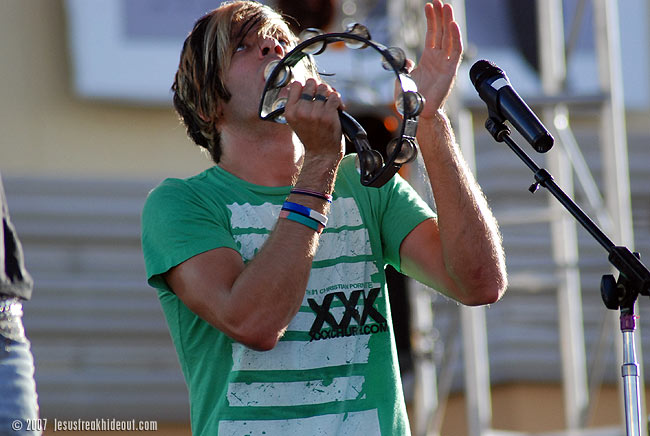 Between Family Force 5 and the unfortunate simultaneous 7:45PM shows from Jars Of Clay and Hawk Nelson, shark victim Bethany Hamilton shared her testimony on the main stage. And when it came time to decide who best to see following her message, we chose Jars Of Clay at the Yard Stage first. They had already begun their opener "Good Monsters" by the time we'd arrived back at The Yard, and it was a shocker to anyone who hadn't heard of their summer fest garb to find the six-piece alt pop/rock group clad in gym shorts and polo tees. Looking like a band of retro joggers (Jars of Clay is "JOC"... get it? Yeah, it's a stretch), it was fun to see that the guys still had a sense of humor, but it definitely clashed with the mood of some of their songs. By the time "Work" followed as the second song, the more serious rock anthem of loneliness just didn't have as poignant an impact being received from the brightly-colored, short-shorts-wearing Jars guys. Nevertheless, Jars Of Clay put on a fantastic set, and I found myself getting lost in the music. "Work" was immediately followed up by "God Will Lift Up Your Head," and "Nothing But The Blood" for a rousing segment of upbeat worship, and then the guys moved right into "Take Me Higher" from their latest album Good Monsters. In the twelve-plus years I've seen the band live - since the first time when they opened for PFR before their debut had even come out - this marked the first time I'd ever seen the guys live in a festival setting, and it was fun to experience the different feel.