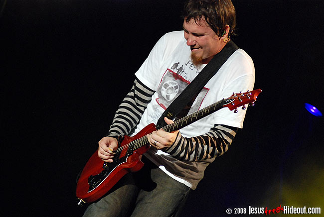 Over at the Hollywood Stage, Jeremy Camp was headlining, while Atlanta rock band Third Day brought a close to The Yard Stage. We opted for Third Day's set and it was great to hear the band perform more songs from their latest album, Revelation, than we'd heard on their Spring tour. But just like with that tour, the band opened with "Tunnel," "I Got A Feeling," and "RockStar" to get the fans riled up with familiar material. But then they jumped into the opening track from Revelation, "This Is Who I Am," a solid, rocking anthem that sounds fantastic in the Third Day set lineup. After a short, sort of interlude version of "Cry Out To Jesus," the band played the infectious hit single "Call My Name" before Mark Lee tore up a guitar solo into the Rich Mullins classic, "Creed." Another rocker from Revelation, "Slow Down," followed, with an updated version of the oldie "Thief," before front man Mac Powell picked up his acoustic for "I've Always Loved You" from their album Time. At this point, bassist Tai Anderson addressed the crowd to share about the band's USO Tour experience earlier this year where they learned about a fallen soldier while they were in Iraq. Anderson shared that they have since gotten to know the family of that fallen soldier and expressed the band's support for the troops, something that inspired the next song, "Always Be True." "I Believe" was next, followed by Powell talking about the new album and its meaning before launching into the title track, "Revelation" to close out their set. However, an encore was expected and they returned for rocker "The Otherside" and the worshipful "Show Me Your Glory." Then a couple of festival founders joined the band on stage to lead the RTU festival in a candlelighting service, and Third Day closed Rock The Universe 2008 worshipfully with "God Of Wonders."