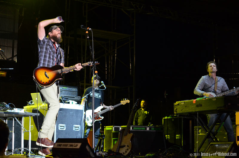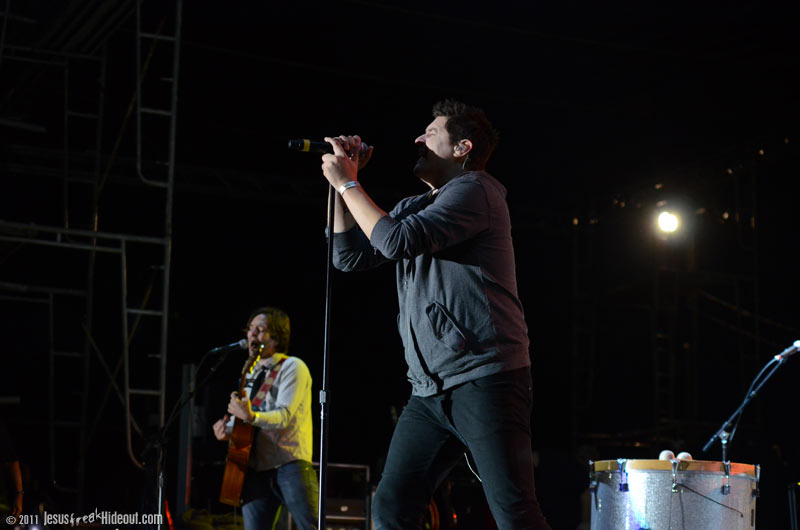 I traded Kutless' set to spend some time back at the JFH table and returned to the Main Stage area later to find that KJ was giving a message as the evening's speaker. When he was done, there was an extensive soundcheck (and a whole lot of standing around and waiting) as Jars of Clay didn't get to perform until 8:40, an hour later than their scheduled 7:35 spot. Their set was also cut short, only allowing them to play seven songs, which was unfortunate because it was one of the more fun sets of the day. The Jars guys opened with Long Fall... hit single "Two Hands" before bringing out some of their newer songs from The Shelter, including "Small Rebellions" and then the title track, which was especially powerful to hear amongst a sizable audience. Their career-defining hit "Flood" followed, and then a personal favorite, the rocker "Work" from Good Monsters. "Dead Man (Carry Me)" was a nice touch to follow it before they closed prematurely with the anthemic worship song, "We Will Follow" from Shelter. This actually made a nice segue into David Crowder*Band's worship set. I headed back to the table for a bit and returned to the stage to find the guys performing "Foreverandever Etc." It was surreal watching their show and knowing that this was David Crowder*Band's absolute last festival appearance (before their final tour this fall). The band's superior cover of John Mark McMillan's "How He Loves" was a great set addition before Crowder paused to remark on how cold the Pennsylvania night air was, which he wasn't used to being from Texas. They then broke into their "hodown" portion of their set with a boisterous performance of "I Saw The Light" and "I'll Fly Away." The upbeat praise anthems then continued with "Oh Happiness" and "O Praise Him," before the worship super group closed with the dancy "Sing Like The Saved."