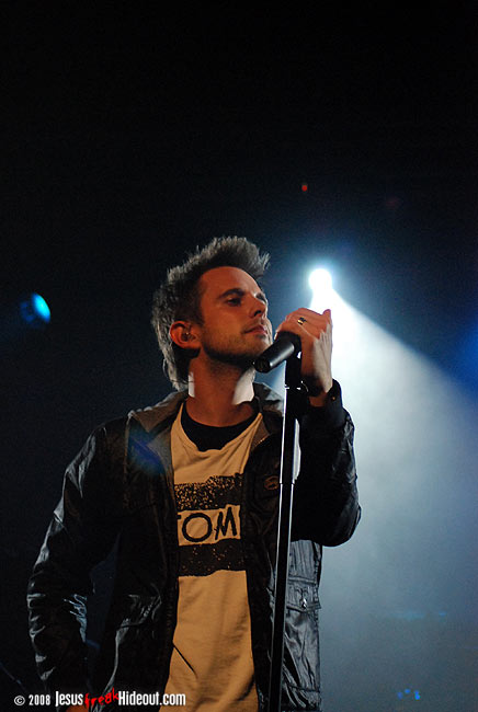 After another break, Sanctus Real stepped out - much to my surprise - to the sound of the title track from their previous album, The Face Of Love. It's a beautiful rock ballad with a wonderful worshipful heart (and without being cliche), but it seemed like a rather mellow song to open with... especially when it's not even on the album the tour is named after! But next up was their cover of U2's "Beautiful Day" to pump up the enthusiastic audience. And an old fan favorite, "Say It Loud" was a nice surprise that went over well with the crowd, followed by front man Matt Hammitt's introduction of each Sanctus member. "Alone" was next, nicely succeeded by "The Fight Song" and then their new classic, "I'm Not Alright." Hammitt addressed the crowd again before "Don't Give Up" and then announced the next song, "Eternal," as being written as sort of an answer to it. Sanctus called for a bit of singalong participation with "Eternal" and then went into "Whatever You're Doing (Something Heavenly)." Hammitt dedicated the next song, "Lay Down My Guns" to the service men and women, and followed it immediately with a wonderful surprise acoustic performance of the otherwise rocker "Closer," for which the band left the stage during, leaving Hammitt alone with his guitar and mic to lead the audience. It was a beautifully dramatic moment and one that connected well with the fans familiar with the song. The rest of the guys came back out after the song to perform their original worship anthem, "Sing," to close their set.