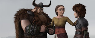 The content of the movie is clean for the most part. Only on two occasions is the term "gods" used as a Viking play on words for "Oh my G-d." There is plenty of comic mischief and mild violence. It is however a family movie, and there are no traces of blood anywhere in the film, even in places we'd expect to find it. Drago's character is menacing and may prove scary to younger viewers. There is plenty of flirting from Snotlout (voice of Jonah Hill) and Fishlegs (Christopher Mintz-Plasse) toward Ruffnut (Kristen Wiig) and from Ruffnut toward one of the film's new characters, Eret (Kit Harington). Hiccup and Astrid share a kiss or two and some minor flirting when together, but they have reached a new stage in their lives after all.