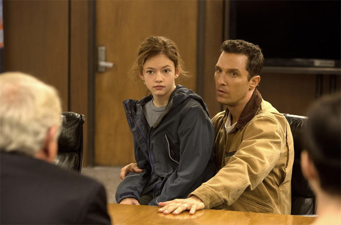 The content is of the PG-13 brand for sure, mostly due to a couple really tense and kind of dark moments, and some profanity. Huge chunks of the movie have little to no profanity at all, which is refreshing, but when circumstances become life-threatening, the "S" word starts to be used. And during a heated argument, McConaughey possibly mutters the "F" word once, and then says it very clearly in a later scene. There's so little language in the movie as a whole that when the language does start up, it really isn't necessary (and wasn't missed). The dark moment of the film is very reminiscent of Inception, where a couple really tense storylines are happening simultaneously and we cut back and forth between them. Things seem one way for a while and then suddenly go really sour. It's not as gruesome or violent as some similar Nolan moments like these have been, but it'll have a lot of viewers gripping their seats.