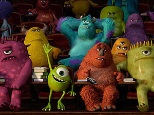 It's been twelve years since Pixar introduced the lovable scarers Mike Wazowski and James P. Sullivan. The unique tale about a world of monsters that use the screams of frightened children to power their lives has become a modern Disney classic, and I think it's pretty safe to say that no fan of the film would have ever imagined that a prequel would be made for the potential franchise. In 2001's Monsters, Inc., Mike and Sulley meet a human toddler that Sulley dubs "Boo" and through their encounter, they realize that humans aren't the evil, toxic creatures they believed them to be. Boo melts Sulley's monstrous heart and she becomes a unique dynamic for Mike and Sulley. Monsters University takes the twosome back to where they first met. The story starts out while Mike is just a little kid on a field trip to Monsters, Incorporated where he meets a celebrated scarer who inspires Mike's lifelong ambition to become the top scarer ever. Monsters University has a completely different feel than Monsters, Inc did in almost every way, which is something that is reinforced by the absence of Boo and the story's focus shift from Sulley to Mike. Furthermore, Mike and Sulley are adults in Monsters, Inc., and here they're quite literally college kids. As such, we meet all kinds of colorful fellow college students -- almost all who share the same interest as fellow "scare majors."