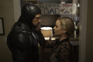 The content can't hold a candle to what I've read is shown in the original 1987 film (seriously, while I haven't seen it, it sounds like there's some truly disturbing violence in it), but some of the stuff you'll see in this 2014 film can be unsettling. When they strip away all of RoboCop's mechanical pieces, we find that the only organic parts of his body are his right hand (a deleted scene explains why), lungs, throat, face and brain. As such, there's a scene where Oldman's character is talking to Alex in front of a mirror and we see his glass-encased lungs, throat and brain graphically active. It's a long sequence and not very subtly presented. If the sight of any of that may disturb you, you'll be surprised that the camera lingers surprisingly long on all of it. A scene a little bit later on shows Alex laying on an operating table with a doctor's blood-tipped fingers holding fine surgical tools to his exposed, bloody brain. This is shown in a couple different graphic views as well. Finally, we see another view of Alex with just his lungs and brain exposed briefly. The car bombing scene where Alex gets hurt is a little intense, and while we don't see his immediate injuries much, they do revisit the sequence later on in the film. We also see some imagery of him bandaged up, missing a leg with scarred skin exposed all over his body while he lies in a hospital bed. There is some language in the film, including a handful of "S" words, an unreasonable amount of blasphemy, a bleeped-out "motherf-----" near the end and a reported audible use of the "F" word (but I didn't notice it, and I'm usually very sensitive to catch them). There's also a brief sensual scene between Alex and his wife where, after putting their son to bed, Alex and Clara begin passionately kissing and he pulls her shirt off, revealing her in a bra as they keep kissing and move to their bed. They're interrupted, however, and the scene never goes any further, but it's sensual enough that it will be awkward for some viewers.