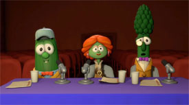 The other story in the same community involves pastor Erwin (Bob the Tomato), who is concerned about his church’s Easter morning Sunday service that will feature the singing performance of one of the church’s members, Cassie Cassava (voiced by Melinda Doolittle, an American Idol finalist). Pastor Erwin is so excited that Cassie, the winner from a talent singing competition, will be coming home for the Easter weekend to sing in his sun-rise church service. He hopes that it might help to boost the attendance of his congregation on Easter morning, when Madame Blueberry reminds him that it is more important to be concerned about the homeless people at a nearby shelter who she wants to serve. When Marlee learns that Cassie is returning to the community for Easter weekend, she becomes determined to find a way to actually get Cassie to perform as the star in her show. The two stories become intertwined when Pastor Erwin reminds Marlee that Cassie can only sing in one performance Easter weekend.