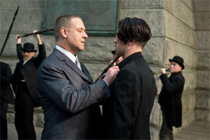 Some movies that aim to establish an alternate universe to our own can end up being more confusing or distracting, leaving more questions than answers while we're watching. It's one thing to show us a galaxy far, far away, but another to establish a place like 1916 New York City as the backdrop for a story involving miracles and supernatural warfare. We're soon introduced to Peter Lake in preset-day New York, as he visits Grand Central Station in search for answers to who he is. We simultaneously see flashbacks to what appears to be his parents, back in the early 1900's, trying to earn passage into the United States. However, his father is turned away for having "consumption," forcing him to take his wife and baby with him. They decide to steal a model ship and stow Peter away in it (much like Moses), sending him back to New York to have a chance at life. We then see Peter grown up, years later, attempting to escape the clutches of a villainous man named Pearly Soames, played by Russell Crowe, who immediately appears to have some kind of otherworldly traits. Peter is rescued by a white horse with special abilities and tries to escape the city. On his way out, he decides to rob one last house (as we then learn he's a professional thief...yet, he is also a mechanic?), and there he meets the 21-year-old, ailing Beverly and instantly falls for her. At this point, the viewer is still wondering what in the world is going on; Peter's a thief who meets a sickly beautiful girl after being guided by a mysterious white horse as he tries to escape an evil, potentially supernatural gang leader... And he's a professional thief, but also a mechanic. Are we getting all this right?