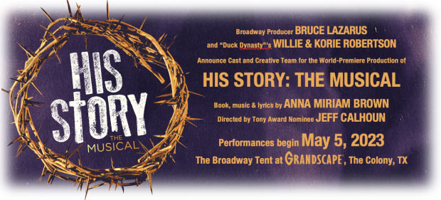 His Story: The Musical features an original book music and lyrics by Anna Miriam Brown, with direction by two-time Tony Award nominee Jeff Calhoun (Disney’s Newsies, Bonnie & Clyde), and is presented by Tony Award-nominated producer Bruce Lazarus, Willie and Korie Robertson (stars of “Duck Dynasty,” New York Times bestselling authors), Brad Reeves / Bill Noble, Thinking Tree LLC, Jill Wilkinson, Cooper Collins, Christian and Sadie Robertson Huff, Mike Collins, and Troy Duhon / Bob Katz in association with Matthew Churchill Productions Ltd.